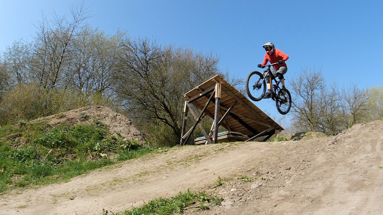 Dieser Clip zeigt den Sprung über ein kleines Gap in Zeitlupe. Aktiver Absprung, um die Weite des Gaps sicher zu überspringen. Das Bike wird in der Luft nach vorne geneigt, um mit beiden Rädern gleichzeitig zu landen.