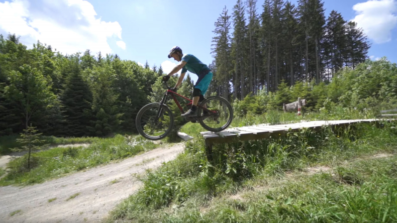 Dieses Tutorial zeigt, wie man mit dem Mountainbike über Drops oder Geländekanten springen kann. Absprung, Flugphase und Landung werden erklärt.