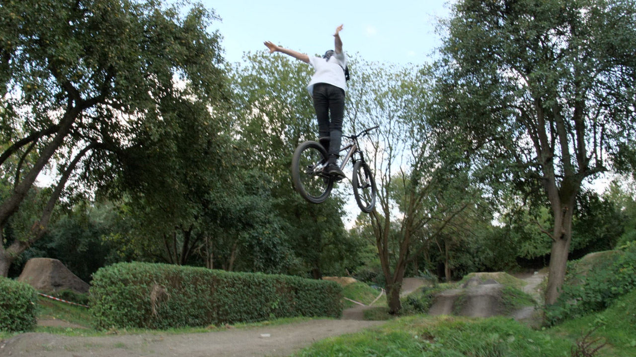 Die Beine klemmen den Sattel ein, damit das Bike beim freihändigen Sprung nicht nach unten wegsackt.