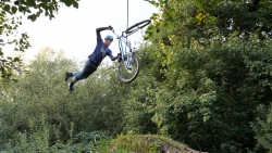 Die Seat Grab Version des Superman. Eine Hand lässt den Lenker los und greift das Bike am Sattel, während der Körper beim Sprung gestreckt über dem Bike liegt.