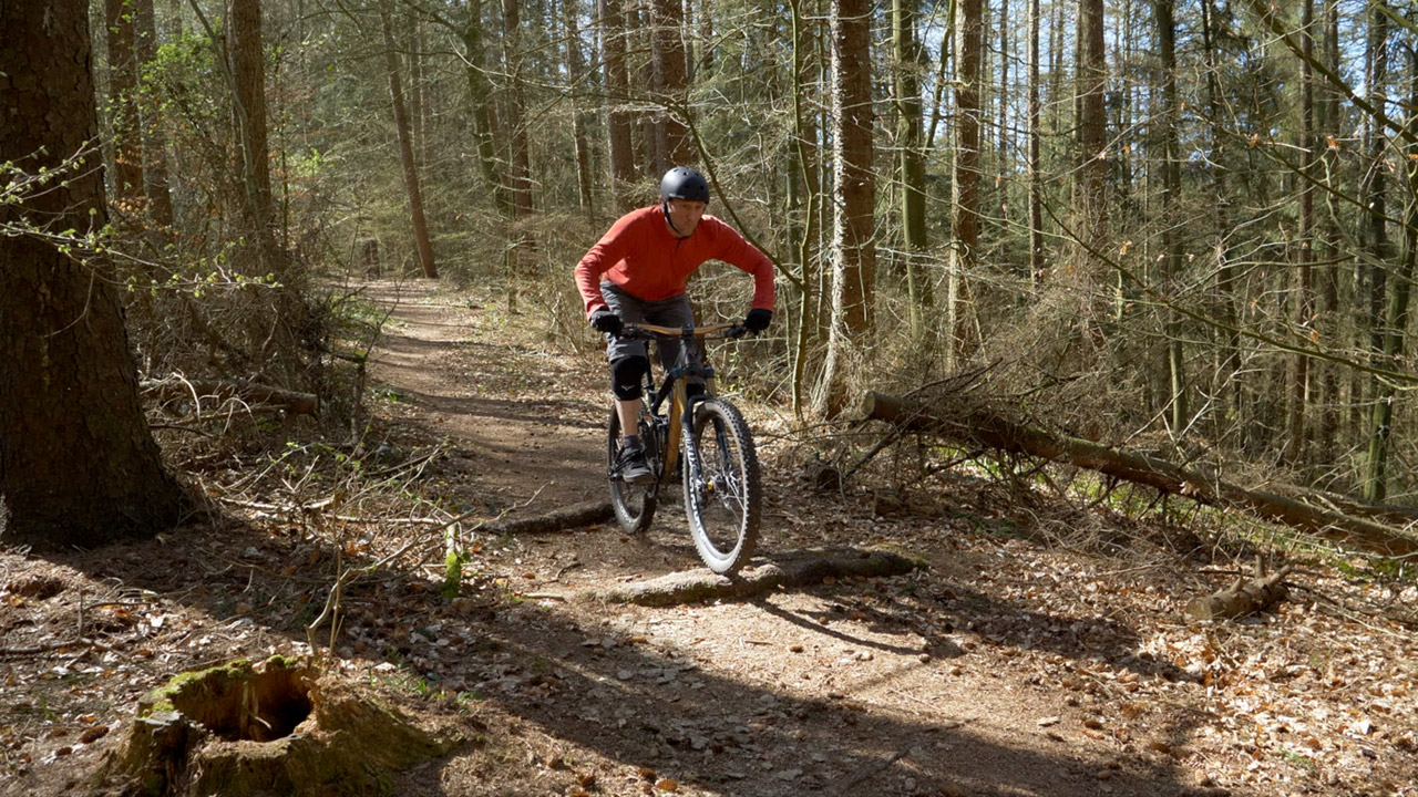 Über einzelne Wurzeln, die quer zur Fahrtrichtung im Boden liegen, kann man mit dem Mountainbike relativ locker fahren. In der Aktivposition rollt man auf die Wurzeln zu, hält beide Pedalen waagerecht und bereitet sich auf das Abfedern der Hindernisse mit Armen und Beinen vor.